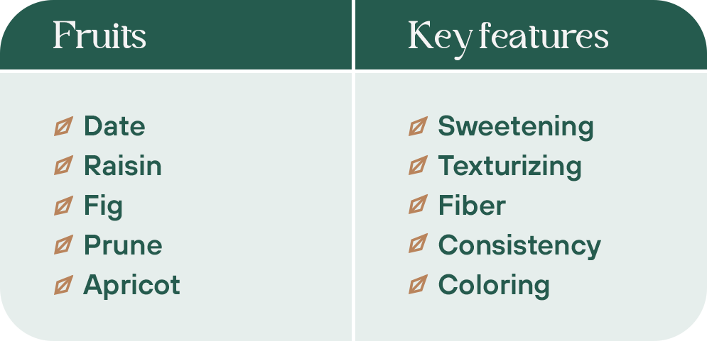 The rich and fruity taste of our dried fruits suits perfectly the confection of sweet treats. Using concentrates as natural sugar alternatives allows you to premiumize and attract more health-aware consumer by unlocking claims such as: no refined sugars, 100% from fruit, etc …